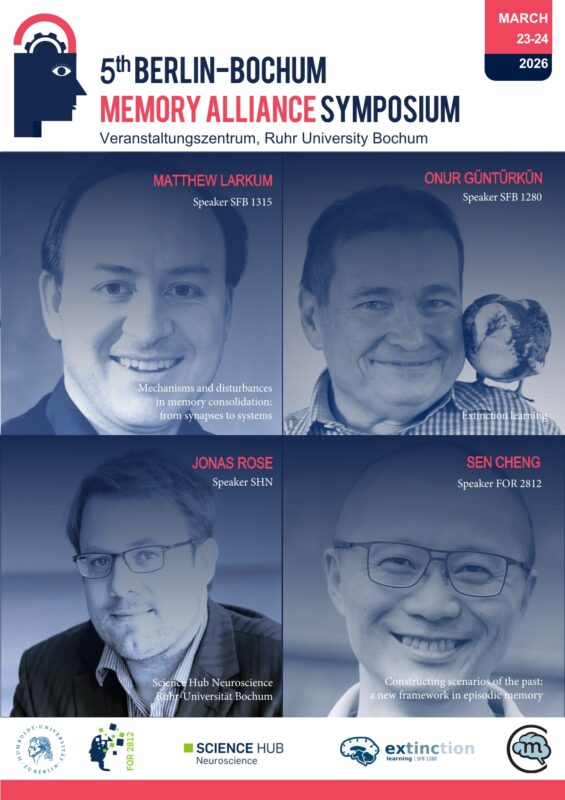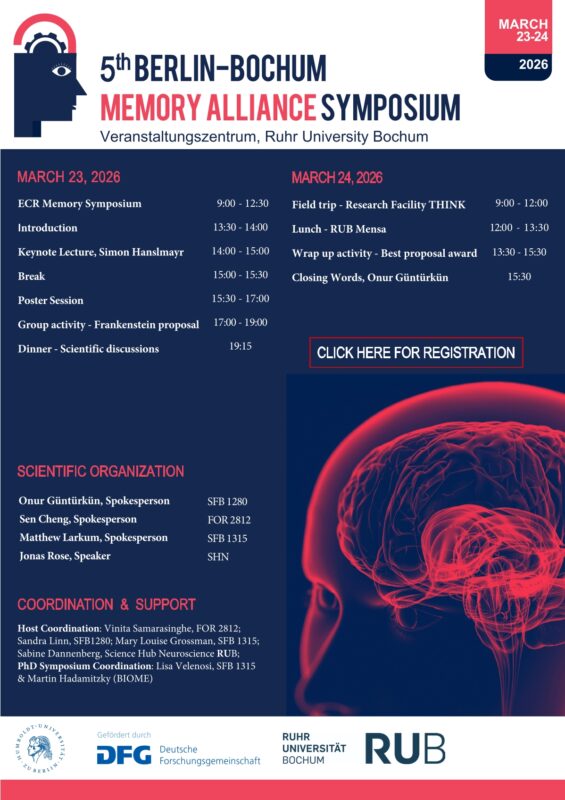 March 23, 2026 09:00–ca 12:30 | ECR Symposium | All PhD and Postdocs are invited | *13:30–14:00 | Introduction | 14:00–15:00 | Keynote | Simon Hanslmayr Hanslmayr_Abstract.pdf | 15:00-15:30 | Break | 15:30-17:00 | Poster session | 17:00-19:00 | Group activity | Frankenstein proposal** | 19:15 | Dinner at Q-West | Scientific discussions | March 24, 2026 | 09:00–12:00 | Field trip | Research Facility THINK | 12:00–13:30 | Lunch | RUB Mensa | 13:30–15:30 | Wrap up group activity | Best proposal award | 15:30 | Closing Words, Onur Güntürkün | * Guests are welcome to take lunch at RUB (Canteen, Rote Beete (vegan), Q-West >>) ** The Frankenstein Propoasl – a method mash up! Most mixed groups of 4-5 persons bring together their expertise and wildest ideas to design a bold joint experiment in limited time. The sky is the limit for budget, there are no laws and no ethics approval is required. What monsters will come to life? >> Our Alliance’s Website: www.memory-alliance.de |